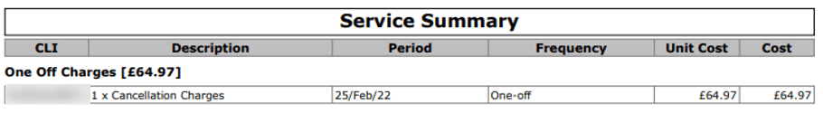 An early termination fee will apply if you decide to cease your services or leave Daisy while you are still in contract. If you are liable for early termination fees this will show on your invoice as “Cancellation Charges”: